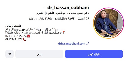 دکتر سبحانی دکترای حرفه ای پزشکی و متخصص در زمینه زیبایی در شیراز به شما زیباجویان محترم کمک میکند تا نواقص صورت خود را برطرف کنید. تزریقات مانند تزریق بوتاکس، تزریق ژل، تزریق فیلر و … با بهترین متریال اولیه و رعایت تمام اصول بهداشتی انجام می شود.