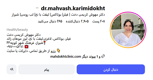 دکتر مهوش کریمیدخت با شماره نظام پزشکی ۲۰۰۸۰۴ از پیشگامان عرصه خدمات زیبایی در شیراز است. کلینیک زیبایی مهدخت را با رویکردی حرفهای و مبتنی بر جدیدترین فناوریهای روز دنیا مدیریت میکند. در این کلینیک، مجموعهای کامل از خدمات زیبایی از جمله تزریق فیلر و بوتاکس با هدف دستیابی به نتایج طبیعی، ایمن و ماندگار ارائه میشود. بهکارگیری برندهای معتبر جهانی، استفاده از تجهیزات پیشرفته و رعایت استانداردهای بهداشتی، کلینیک مهدخت را به یکی از مراکز قابل اعتماد و محبوب در شیراز تبدیل کرده است؛ جایی که مراجعین تجربهای متفاوت، حرفهای و کاملاً شخصیسازیشده را تجربه میکنند. ساعات کاری کلینیک شنبه تا چهارشنبه از ساعت ۳ بعد از ظهر تا ۹ شب و پنج شنبه ۸ صبح تا ۲ ظهر است.