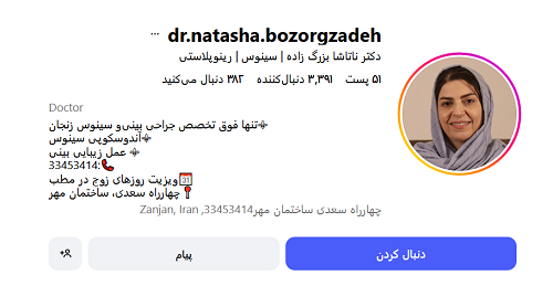 دکتر ناتاشا بزرگ زاده بهترین جراح بلفاروپلاستی در زنجان می باشد. ایشان جراح و متخصص پلاستیک و زیبایی است که پزشکی عمومی و بورد تخصصی خود را از دانشگاه علوم پزشکی تهران اخذ کرده است. دکتر بزرگ زاده میزان رضایتمندی بالایی از جانب مراجعین خود دریافت کرده است. مطب ایشان تمیز و مجهز است و همه روزه آماده خدمت رسانی به بیماران می باشد.