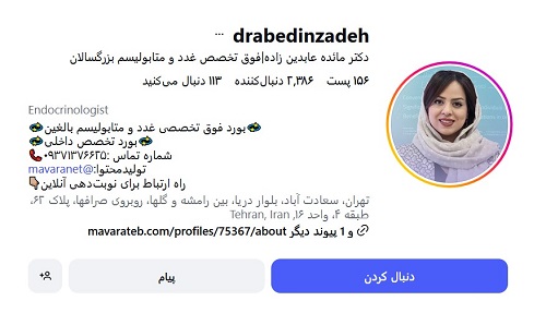 دکتر مائده عابدینزاده، فوق تخصص غدد و متابولیسم بزرگسالان، دارای بورد تخصصی داخلی و بورد فوق تخصصی غدد و متابولیسم بالغین هستند. ایشان از سال ۱۳۸۹ فعالیت پزشکی خود را آغاز کرده و در بیمارستانها و مراکز درمانی معتبر مشغول به ارائه خدمات تخصصی بودهاند. دکتر عابدینزاده با بیش از ۱۴ سال تجربه در تشخیص و درمان بیماریهای غدد و اختلالات متابولیک، توانستهاند رضایت بالای بیماران را جلب کنند. ایشان همچنین عضو انجمن علمی متخصصین غدد درونریز ایران و انجمن پیشگیری و درمان چاقی ایران هستند و با بهکارگیری جدیدترین روشهای تشخیصی و درمانی، مراقبت تخصصی و شخصیسازی شدهای برای بیماران خود ارائه میدهند.