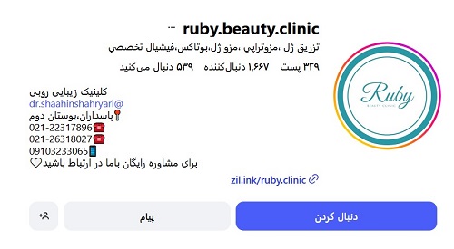 کلینیک زیبایی روبی با رویکردی نوین در حوزه پوست، مو و زیبایی، خدمات تخصصی و متنوعی را زیر نظر پزشکان مجرب ارائه می‌دهد. این مجموعه با بهره‌گیری از تکنولوژی‌های پیشرفته و تجهیزات مدرن، به بهبود طبیعی و ماندگار زیبایی افراد کمک می‌کند. در کلینیک روبی، هر مراجعه کننده بر اساس نیاز و ویژگی‌های فردی، مشاوره و درمان اختصاصی دریافت می‌کند. همچنین محیط آرام و حرفه‌ای این مرکز، تجربه‌ای دلپذیر و مطمئن را برای زیباجویان فراهم می‌سازد. کلینیک زیبایی روبی از شنبه تا چهارشنبه هر روز از ساعت ۱۰ صبح تا ۸ شب و روز پنج‌شنبه از ساعت ۱۰ صبح تا ۵ عصر فعال است. قبل از مراجعه پیشنهاد می‌شود با کلینیک تماس بگیرید تا از ساعت‌های کاری دقیق اطمینان حاصل کنید.