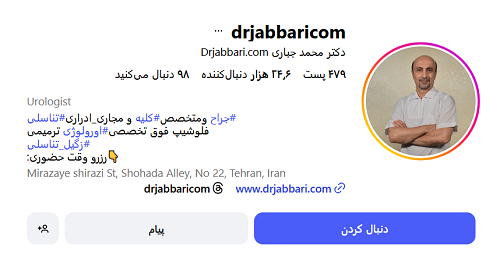 دکتر محمد جباری، جراح و متخصص کلیه، مجاری ادراری و تناسلی، دارای فلوشیپ فوق تخصصی ارولوژی ترمیمی و عضو هیئت علمی وزارت بهداشت، درمان و آموزش پزشکی است. ایشان همچنین عضو فعال انجمن علمی ارولوژی ایران میباشد. دکتر جباری ارائهدهنده خدمات مشاوره و پاسخگویی آنلاین به بیماران است و امکان دریافت راهنماییهای تخصصی درباره جراحی پروستات را به صورت آنلاین فراهم میکند. با استفاده از این خدمات، بیماران میتوانند بدون نیاز به مراجعه حضوری، سوالات خود را مطرح کرده و از مشاوره پزشکی تخصصی بهرهمند شوند.