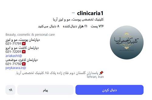 کلینیک تخصصی آریا یکی از بهترین و بزرگ‌ترین کلینیک‌های زیبایی در تهران، محدوده پاسداران، محسوب می‌شود که خدمات حرفه‌ای در زمینه پوست و مو، لیزر، لاغری موضعی و کاشت مو به مراجعین ارائه می‌دهد. این کلینیک با تکیه بر تیمی مجرب و متخصص، با هدف ارائه خدمات زیبایی ایمن، علمی و با کیفیت تأسیس شده است و تمامی اقدامات درمانی و زیبایی بر اساس جدیدترین روش‌های روز دنیا و با تجهیزات پیشرفته و مورد تأیید وزارت بهداشت انجام می‌شود. کلینیک آریا بر این باور است که زیبایی واقعی در سلامت و هماهنگی بدن نهفته است و تلاش می‌کند بهترین تجربه زیبایی و مراقبت از پوست و مو را برای مراجعین فراهم کند.