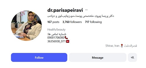 دکتر پریسا پیروی عضو سازمان نظام پزشکی کشور بوده و بورد تخصصی در حوزه پوست مو و زیبایی دارد. ایشان توانسته است با ارائه خدمات با کیفیت در حوزه زیبایی از جمله تزریق ژل لب روسی رضایت بسیاری از افراد را به خود اختصاص دهد و سابقه کاری فوق العاده درخشانی را در کارنامه خود به ثبت برساند. لازم به ذکر بوده که ایشان تمامی خدمات پزشکی و زیبایی خود را در محیط امن و بهداشتی ارائه میدهد.