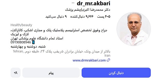 دکتر محمدرضا اکبری جراح و متخصص چشم می باشد که مدرک فوق تخصصی خود را در رشته جراحی پلاستیک چشم دریافت نموده است. ایشان سابقه تدریس در دانشگاه علوم پزشکی تهران را دارا هستند و عضو انجمن چشم پزشکی تهران نیز می باشند. دکتر اکبری عضو کومیته ارزشیابی برنامه آموزش تخصصی فوق تخصصی می باشد و ریاست بیمارستان فوق تخصصی چشم فارابی را نیز دارا بوده است. ایشان هم اکنون از بهترین جراحان مجرای اشکی به شمار می روند که عضو کومیته امتحانات فلوشیپی نیز بوده اند.