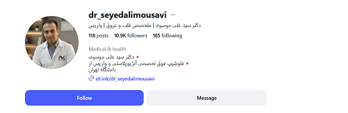 دکتر موسوی فلوشیپ فوقتخصصی اینترونشنال و ورید از دانشگاه تهران هستند که به صورت تخصصی بر درمانهای بسته واریس تمرکز دارند. ایشان در مطب مجهز خود در جهانشهر، با استفاده از تکنولوژی لیزر و بدون نیاز به بیهوشی، نارساییهای وریدی را در یک جلسه درمان میکنند. در پیج اینستاگرام ایشان میتوانید ویدیوهای آموزشی و نمونههای واقعی از قبل و بعد درمان بیماران را مشاهده کنید. مراجعین ایشان بر تشخیص دقیق و برخورد صبورانه وی تاکید دارند که باعث شده یکی از پزشکان مرجع کرج در حوزه عروق باشند.